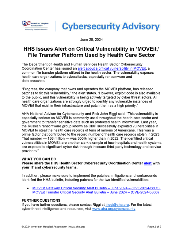 AHA National Advisor for Cybersecurity and Risk John Riggi said, “This vulnerability is especially serious as MOVEit is commonly used throughout the health care sector and government to transfer sensitive data such as protected health information. Last year, the Russian ransomware group known as Cl0P successfully exploited vulnerabilities in MOVEit to steal the health care records of tens of millions of Americans. This was a prime factor that contributed to the record number of health care records stolen in 2023. That number — 136 million — was 300% higher than in 2022. The identified critical vulnerabilities in MOVEit are another stark example of how hospitals and health systems are exposed to significant cyber risk through insecure third-party technology and service providers.”