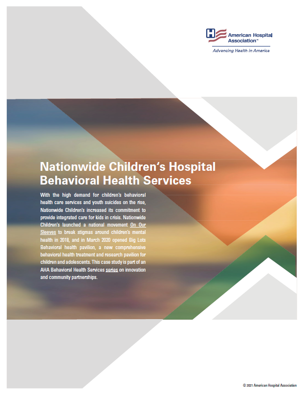 With the high demand for children’s behavioral health care services and youth suicides on the rise, Nationwide Children’s increased its commitment to provide integrated care for kids in crisis. Nationwide Children’s launched a national movement On Our Sleeves to break stigmas around children’s mental health in 2018, and in March 2020 opened Big Lots Behavioral health pavilion, a new comprehensive behavioral health treatment and research pavilion for children and adolescents. This case study is part of an AHA Behavioral Health Services series on innovation and community partnerships.