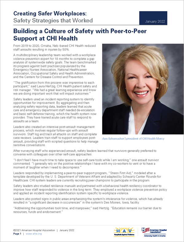Safety leaders also studied resilience manuals and partnered with a behavioral health resiliency coordinator to improve how staff responded to violence in the long term. They employed a workplace violence prevention policy and applied an incident reporting identification system specific to workplace violence.