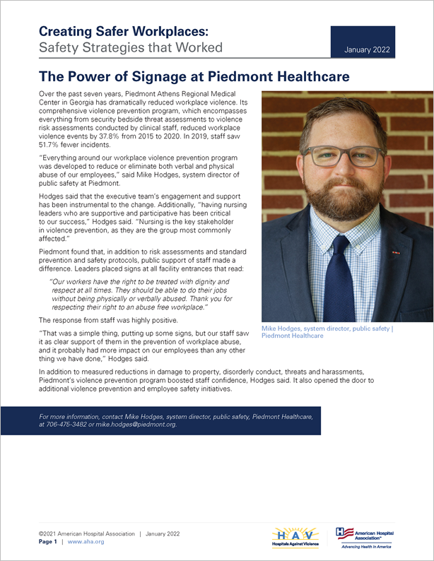 “Everything around our workplace violence prevention program was developed to reduce or eliminate both verbal and physical abuse of our employees,” said Mike Hodges, system director of public safety at Piedmont.