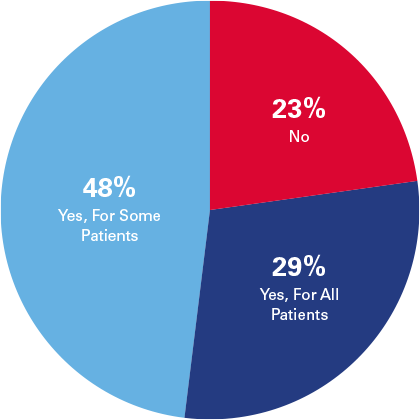 - 77% of respondents reported screening patients for social needs. Those who do screen reported screening patients for a broad range of needs.
