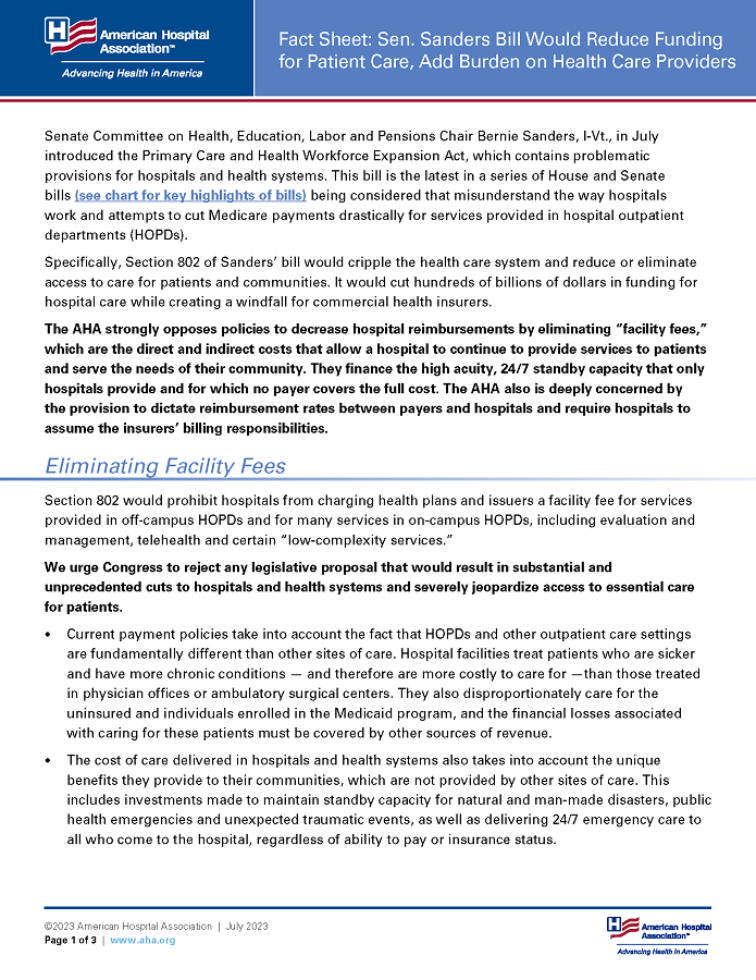 Senate Committee on Health, Education, Labor and Pensions Chair Bernie Sanders, I-Vt., in July introduced the Primary Care and Health Workforce Expansion Act, which contains problematic provisions for hospitals and health systems. This bill is the latest in a series of House and Senate bills (see chart for key highlights of bills) being considered that misunderstand the way hospitals work and attempts to cut payments drastically for services provided in hospital outpatient departments (HOPDs).