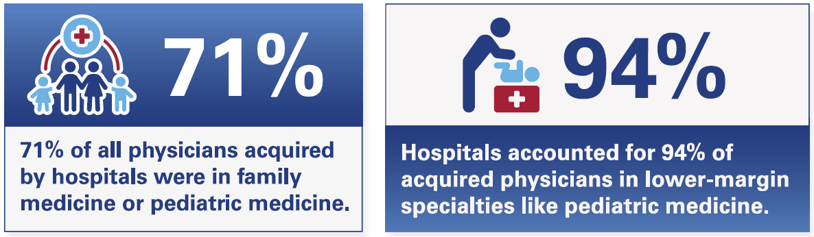 In fact, 71% of all physicians acquired by hospitals were in family medicine or pediatric medicine between 2019 and 2024, indicating hospitals’ focus on providing access to essential care in primary and pediatric specialties.