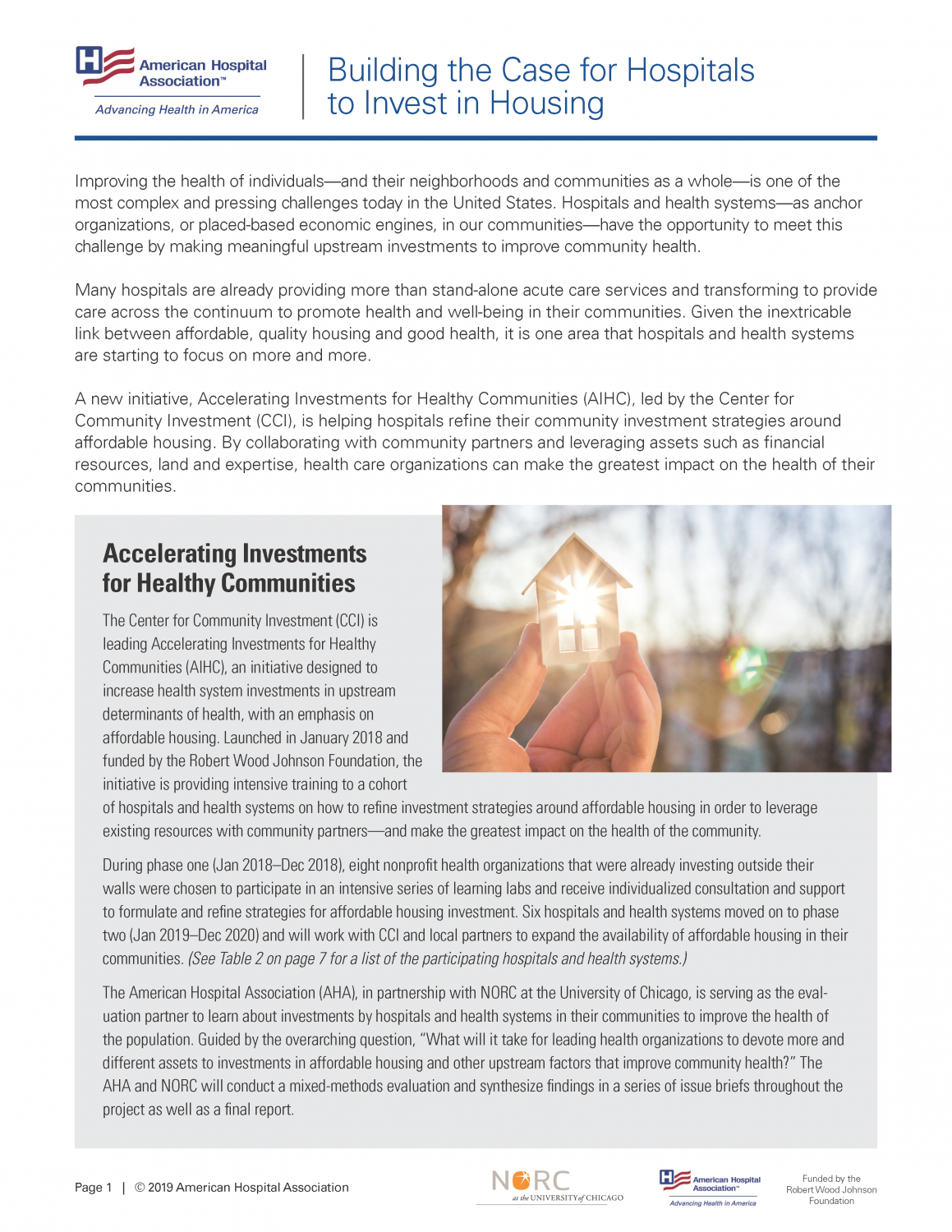 Improving the health of individuals—and their neighborhoods and communities as a whole—is one of the most complex and pressing challenges in health care today. Given the inextricable link between affordable, quality housing and good health, housing is one area that hospitals and health systems are starting to focus on more and more. A new initiative, Accelerating Investments for Healthy Communities, led by the Center for Community Investment and funded by the Robert Wood Johnson Foundation, is helping hospitals refine their community investment strategies around affordable housing. The American Hospital Association and NORC at the University of Chicago are partnering to learn from the journeys of participating hospitals and sharing initial findings in this issue brief, Making the Case for Hospitals to Invest in Housing.
