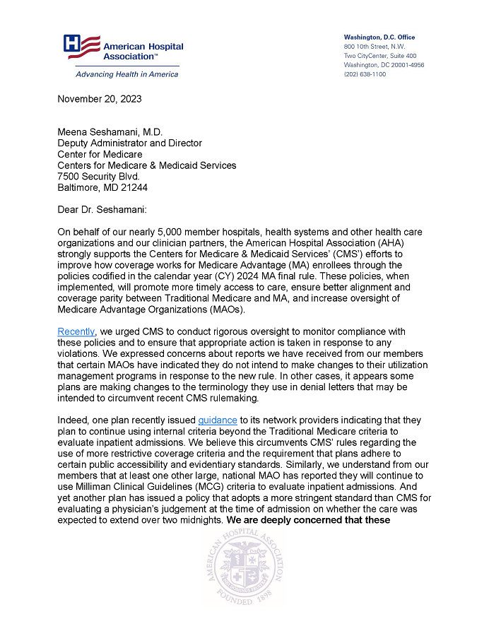 AHA Urges CMS to Swiftly Correct Medicare Advantage Plan Policies That Appear to Violate CY 2024 Rule