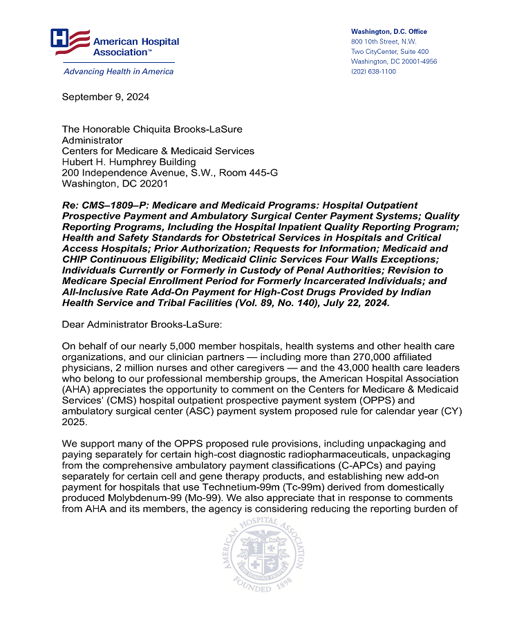 On behalf of our nearly 5,000 member hospitals, health systems and other health care organizations, and our clinician partners — including more than 270,000 affiliated physicians, 2 million nurses and other caregivers — and the 43,000 health care leaders who belong to our professional membership groups, the American Hospital Association (AHA) appreciates the opportunity to comment on the Centers for Medicare & Medicaid Services’ (CMS) hospital outpatient prospective payment system (OPPS) and ambulatory surgical center (ASC) payment system proposed rule for calendar year (CY) 2025.