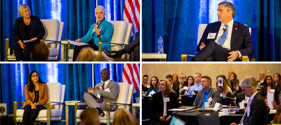 Pictured, above, from top left going clockwise: Maryjane Wurth, executive vice president and chief operating officer, AHA, and AHA Chair-elect Melinda Estes, M.D., president and CEO of Saint Luke's Health System in Kansas City, Mo.; Jason Spring, chief strategic officer for Kalispell (Mont.) Regional Healthcare and a member of the AHA Board of Trustees; Priya Bathija, vice president of The Value Initiative, and Kaakpema “KP” Yelpaala, founder and CEO of access.mobile; and attendees of the forum.
