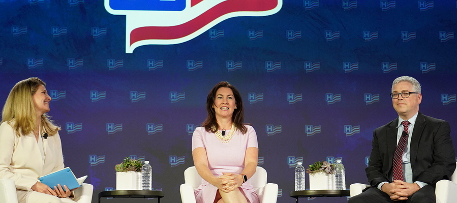 Leaders from the Centers for Medicare & Medicaid Services at the 2025 AHA Annual Membership Meeting May 5 discussed issues on the agency’s agenda in a fireside chat moderated by Ashley Thompson, AHA senior vice president, public policy analysis and development. Stephanie Carlton, CMS deputy administrator and chief of staff, and John Brooks, CMS deputy administrator and chief policy and regulatory officer, discussed regulatory burden and oversight of commercial health insurance plans, among other topics.