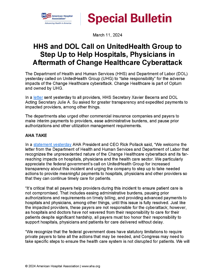 In a statement yesterday AHA President and CEO Rick Pollack said, “We welcome the letter from the Department of Health and Human Services and Department of Labor that recognizes the unprecedented nature of the Change Healthcare cyberattack and its far-reaching impacts on hospitals, physicians and the health care sector. We particularly appreciate the federal government’s call on UnitedHealth Group for increased transparency about this incident and urging the company to step up to take needed actions to provide meaningful payments to hospitals, physicians and other providers so that they can continue timely care for patients.